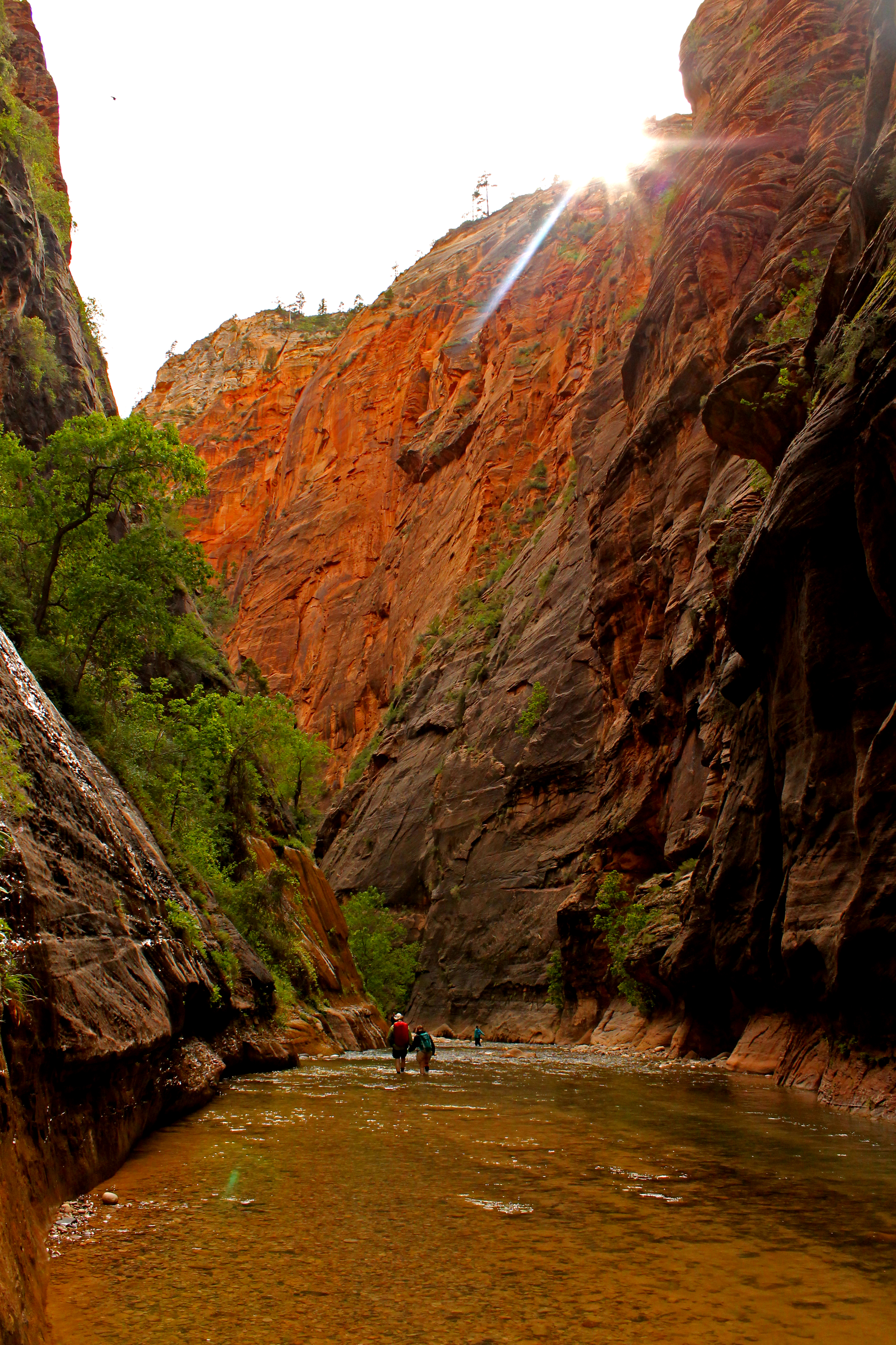 Mississippi or the Colorado but over time is has managed to carve out some of the most beautiful canyons in Zion thanks to the composition of the sandstone. The Narrows is a great day hike for the hot summer months but can become closed in the winter months due to the high frequency of flash floods. The towering cliffs provide constant shade as you wade through the cool waters of the Virgin River. Plan to get wet! You can easily avoid any deep spots by continually crossing the river. More than half of the hike is in the shallow river, about knee deep, while the rest is on rocky or sandy riverbanks. From top down the canyon is a 16 mile hike which is possible in one day but requires a backpacking permit for any overnight trips in the canyon. However, the most easily accessible hike is by walking upriver into the canyon and then back out when you choose.